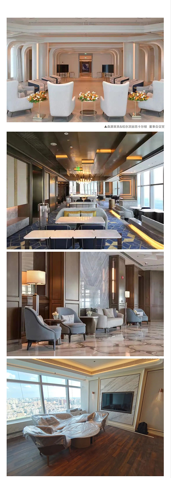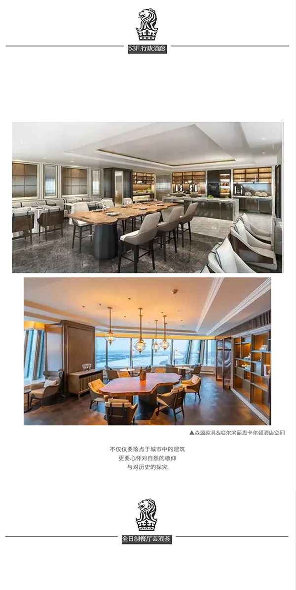 十分感謝富力集團(tuán)&哈爾濱麗思卡爾頓酒店,森源家具有幸承接了酒店核心版塊:首三層所有公共區(qū)域包含到達(dá)大堂、所有ES行政套房、五十三層行政酒廊、五十四層空中大堂和空中酒廊區(qū)、三十七層泳池及健身房區(qū)等**定制家具。