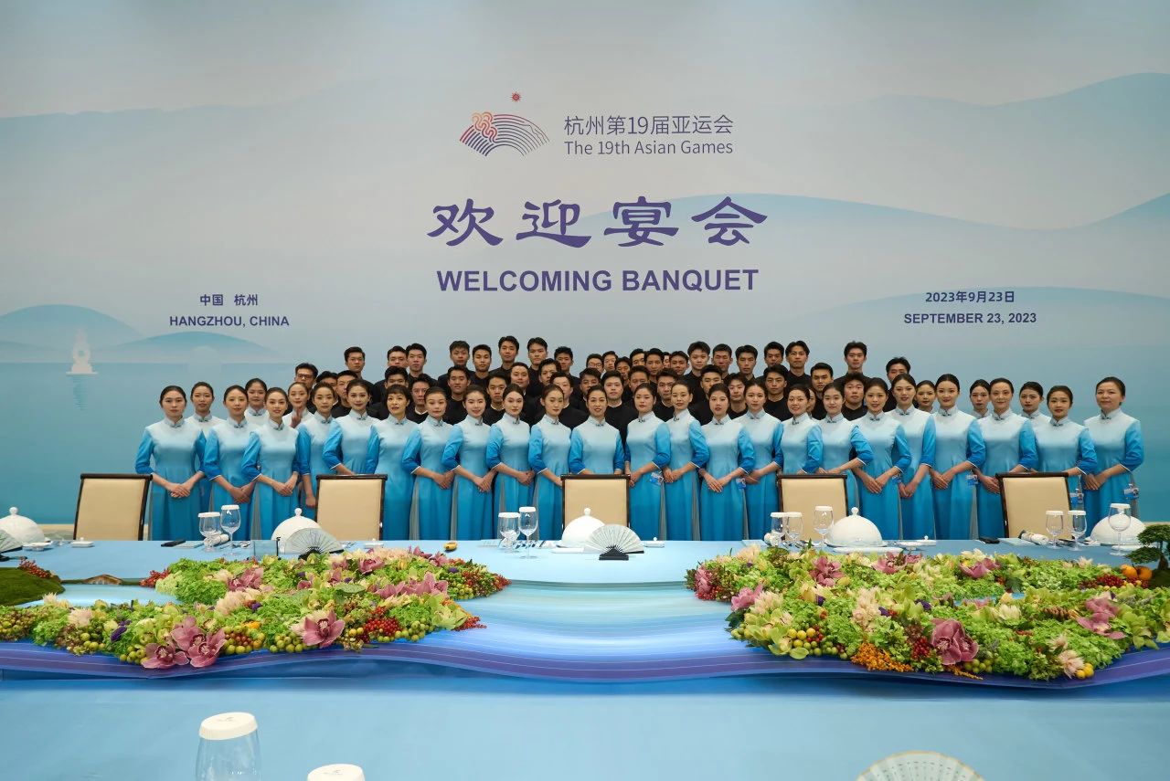 身著亞運潮涌元素禮儀服飾的國賓服務(wù)團(tuán)隊
